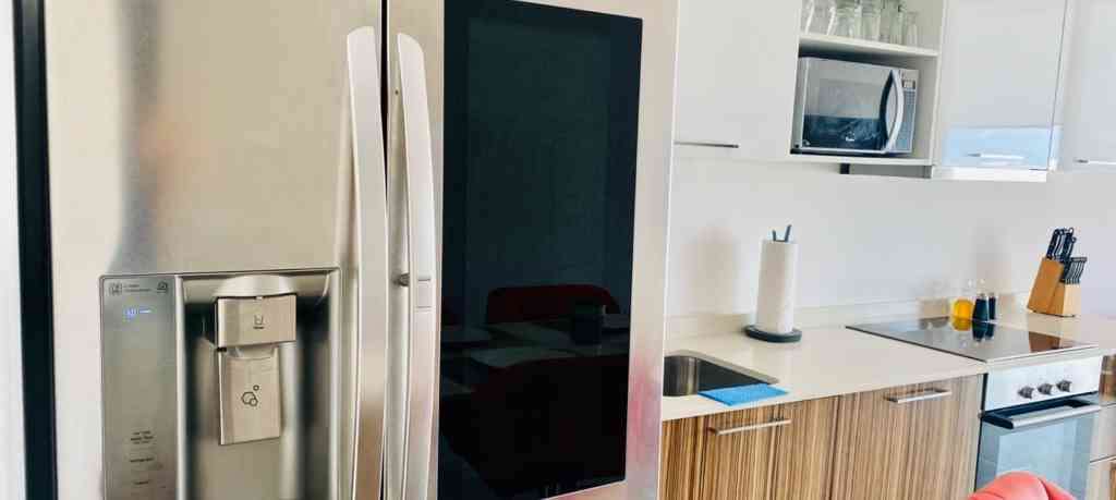 There are household appliances: a refrigerator, a large TV in the living room, a vacuum cleaner, a coffee machine, a blender, a microwave and many other small things.