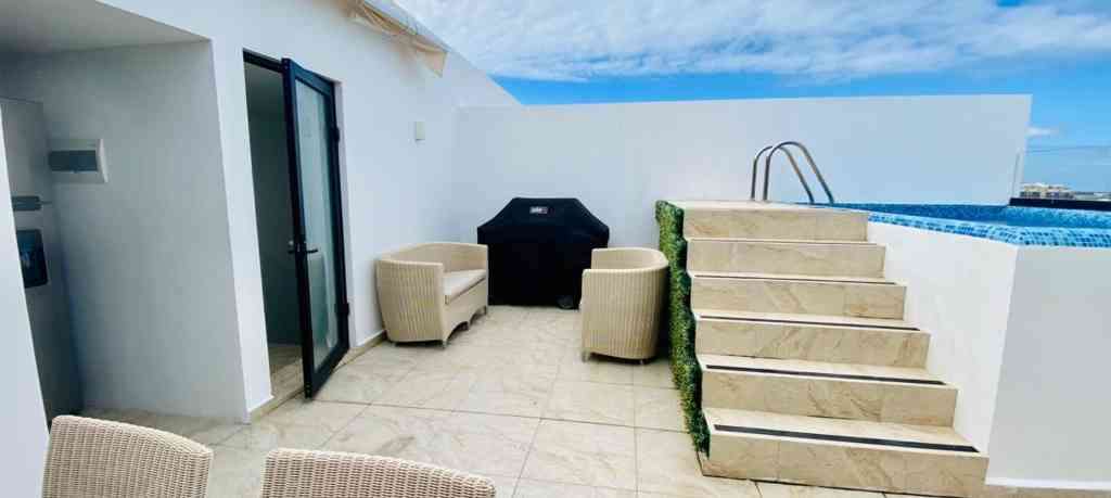 The apartment is located on the top floor of the building and has access to its own large terrace with a swimming pool, barbecue, refrigerator, shower, toilet, and sun loungers.