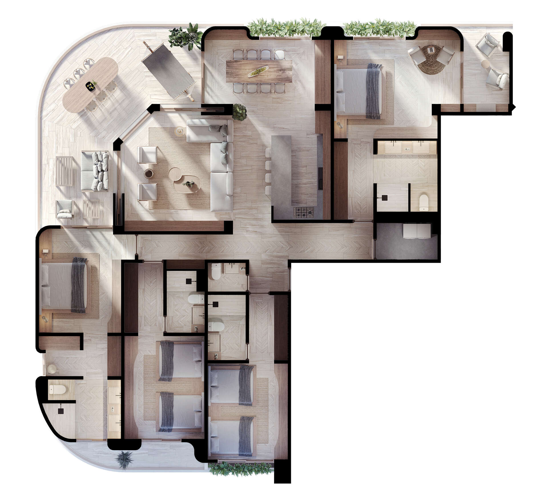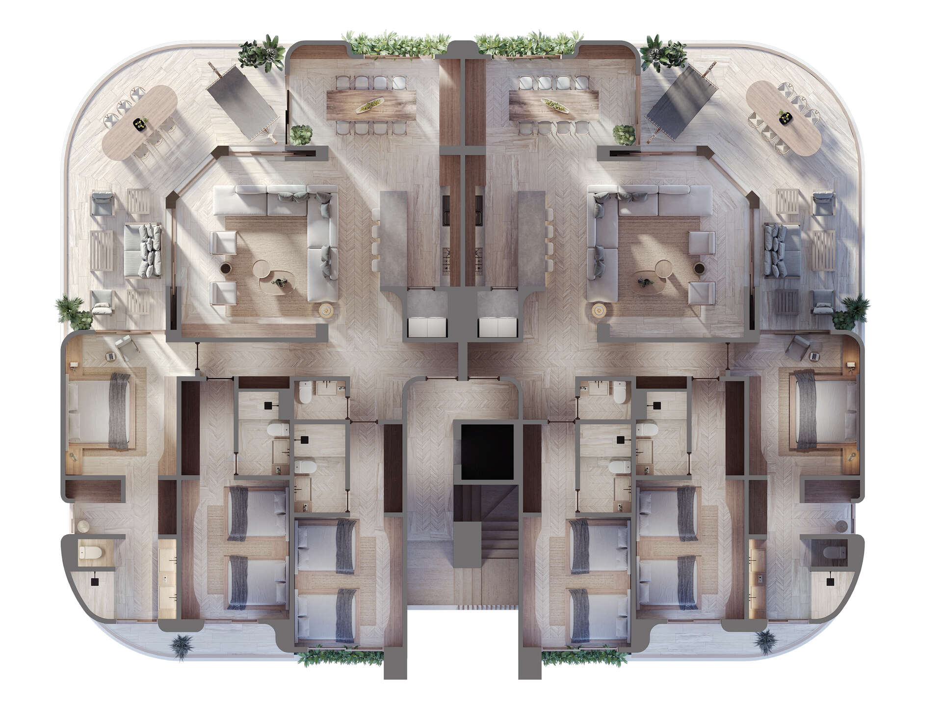 Огромные квартиры с большими террасами и панорамными окнами с видом на море, от 169 квадратных метров с двумя спальнями до 300 метров с четырьмя спальнями.