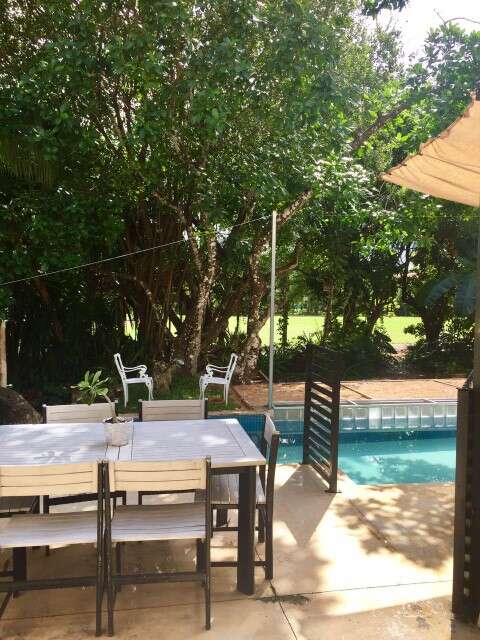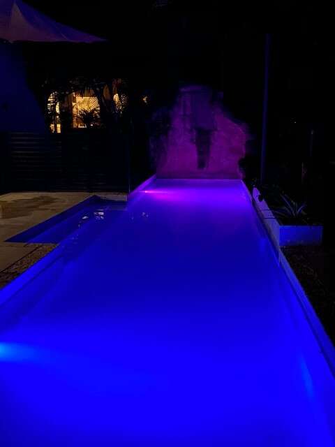 Бассейн построен на всю ширину участка, по длине не менее пятнадцати метров и около трех в ширину.